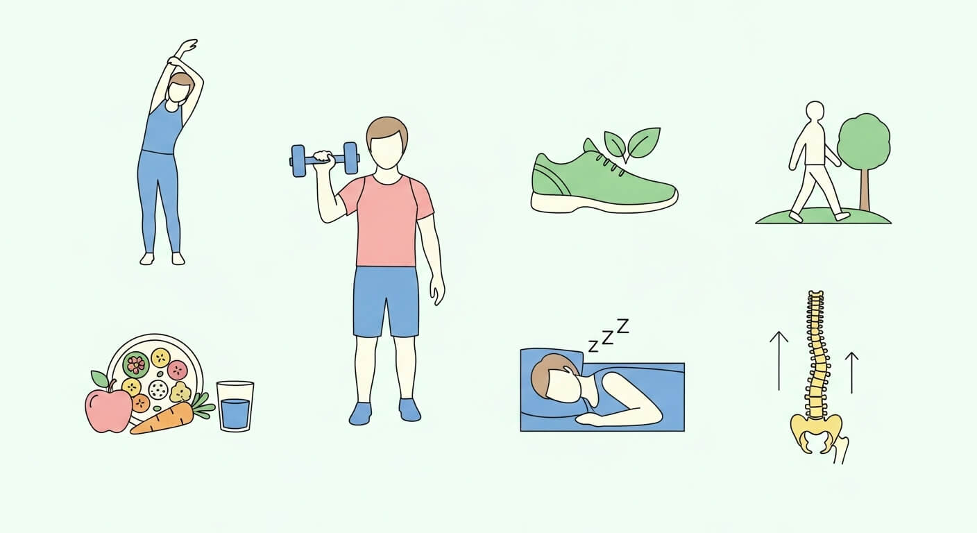 체중 관리, 유연성 운동, 좌식생활 최소화, 의자 자세 교정