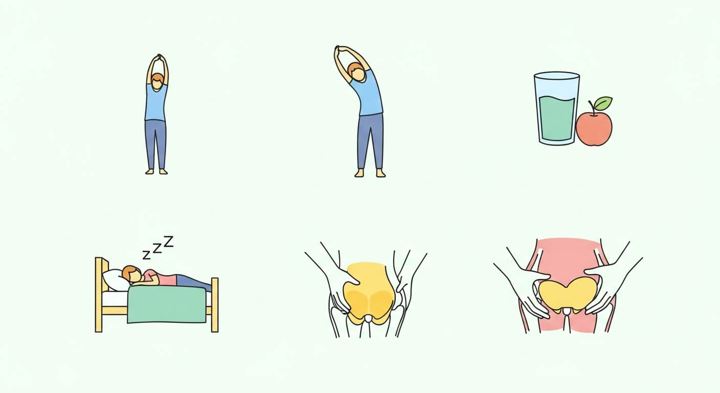 - 수면 시 다리 사이에 베개를 두어 고관절 부담 완화