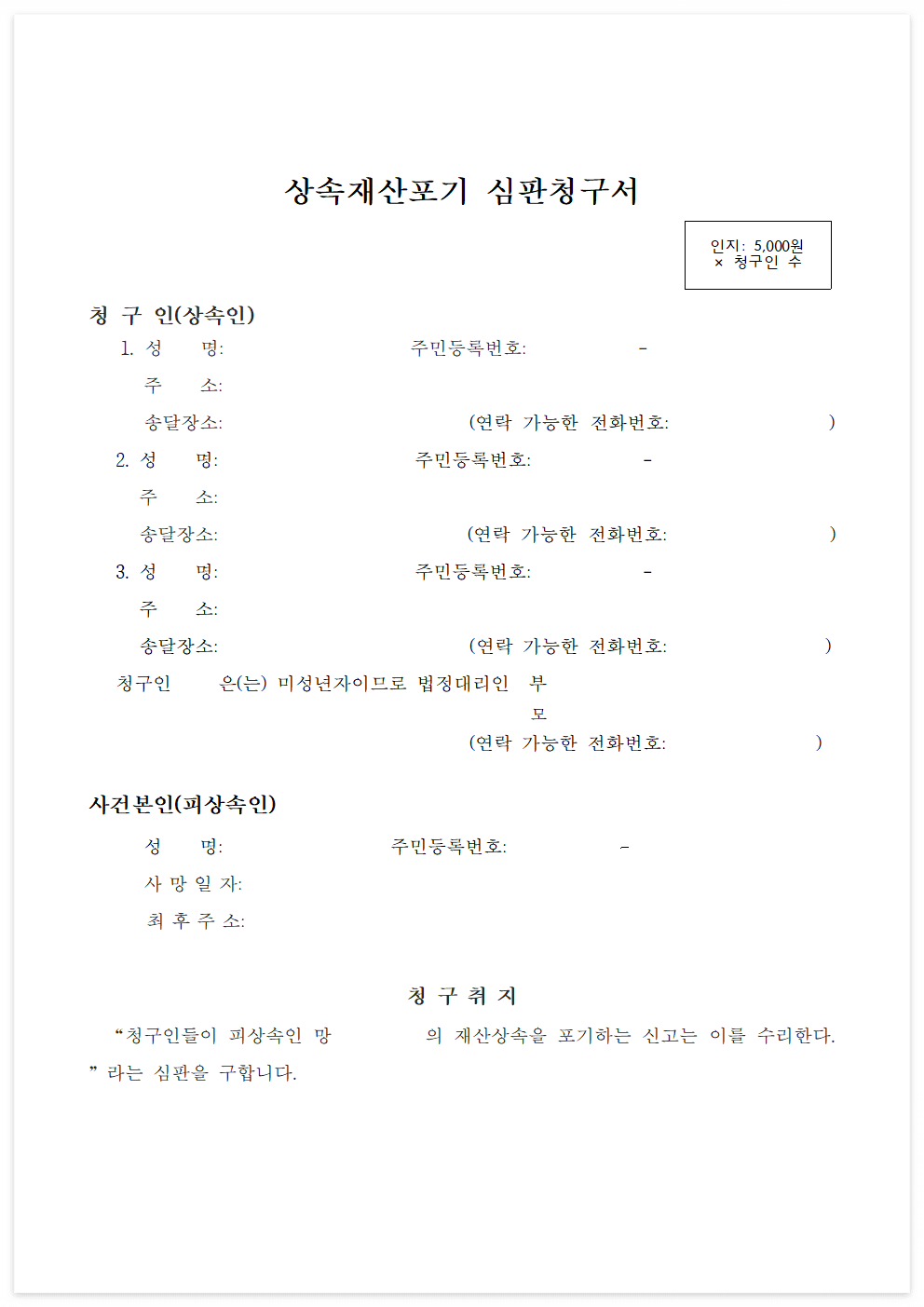 - 상속포기신청서: 법원에 제출하는 공식 서류입니다.